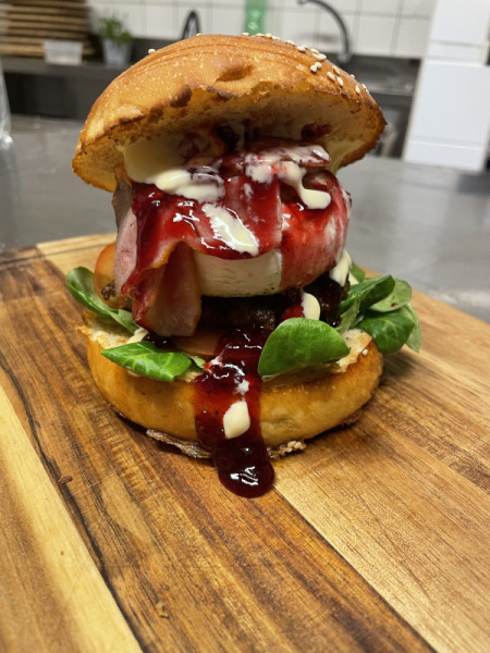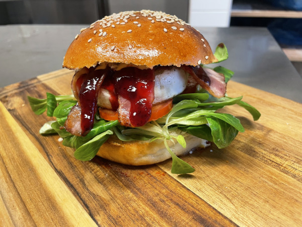 domácí bulka, 160 g hovězí maso, cheddar, polníček, plátky rajčat, grilovaná slanina, amata mayo