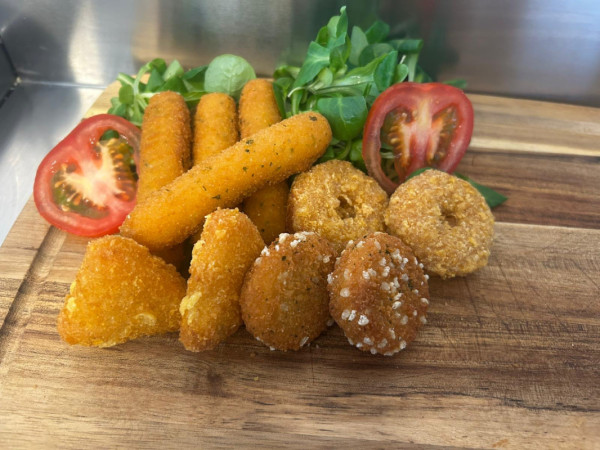 4ks mozzarelové tyčinky, 2x mini camembert, 2x lehce pikantní cheddar v nachos, 2x zauzené sýrové donutky